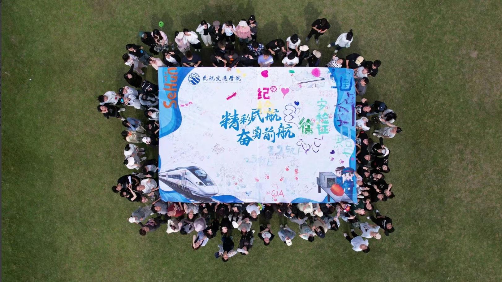在游戏结束之后,每个人都可以拿准备好的颜料,在我们民航的旗子上面画画,印上专属于自己的手掌印。这是非常富有纪念意义且独特的一个活动环节。我们拿着民航的旗子,向着天空招手,预示着迈向更加美好的未来。