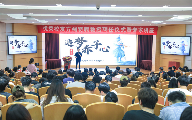 在三楼报告厅,方剑以《追梦赤子心》为题,结合自己在阿里巴巴和杭州遥望网络科技有限公司的丰富经历,分享了数字经济领域的前沿动态、行业趋势,分享了自己的职业发展经验、创业经历和人生感悟。全校近300名师生共同聆听方剑的精彩演讲。现场气氛热烈,掌声不断。