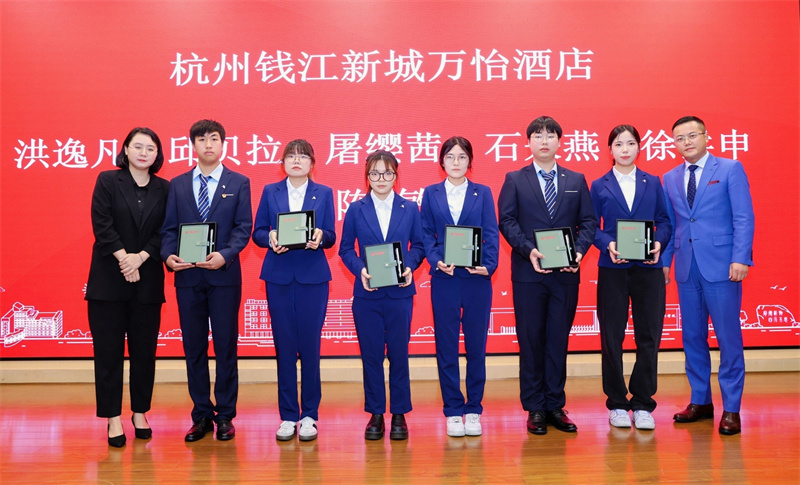 企业导师为“智慧酒店产业学院”第一批学员佩戴徽章并颁发纪念品。