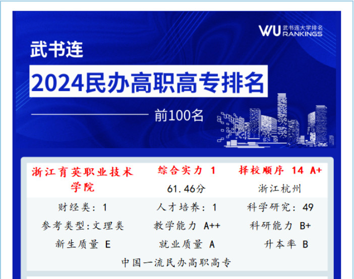 7月24日,武书连2024中国高职高专评价排行榜发布。我校在2024民办高职高专排名综合实力位列全国第1名,财经类位列全国第1名,人才培养位列全国第1名,教学能力位列全国第2名,入选中国一流民办高职高专。
