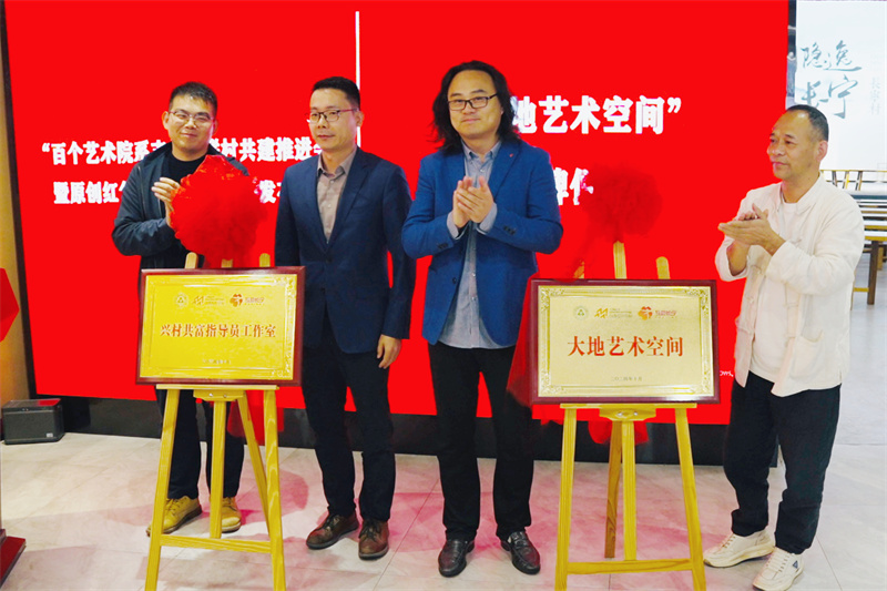 邵帅、王贤军、姜勇军、黄汶俊为“兴村共富指导员工作室”和“大地艺术空间”揭牌。