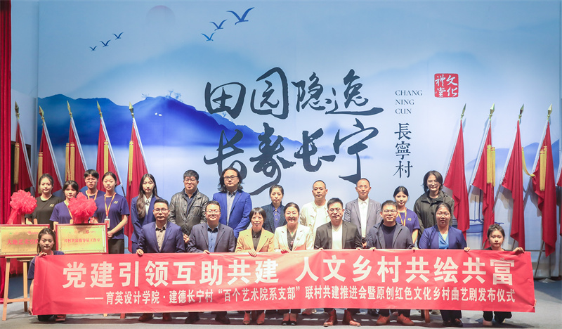 朱宁斌讲话。他说,长宁村与育英学院合作的第四个年头,每一批到来的育英学子都在长宁村的发展历程中留下了鲜明的印记。拍摄的宣传视频、设计的农产品包装都深受游客喜爱。此次共同举办大地时装秀、排演曲艺节目,让“互助精神”更具象、鲜活。感谢师生们用知识和创新的思维,为打造“互助长宁”品牌贡献了智慧和力量。本次联村共建推进会让“兴村共富指导员工作室”、“大地艺术空间”落地,更有国家级“非遗”杭州小热昏代表性传承人周志华共同见证原创红色文化乡村曲艺剧《你侬真好》的发布,相信这些强大助力一定会成为长宁村未来发展的“流量密码”。