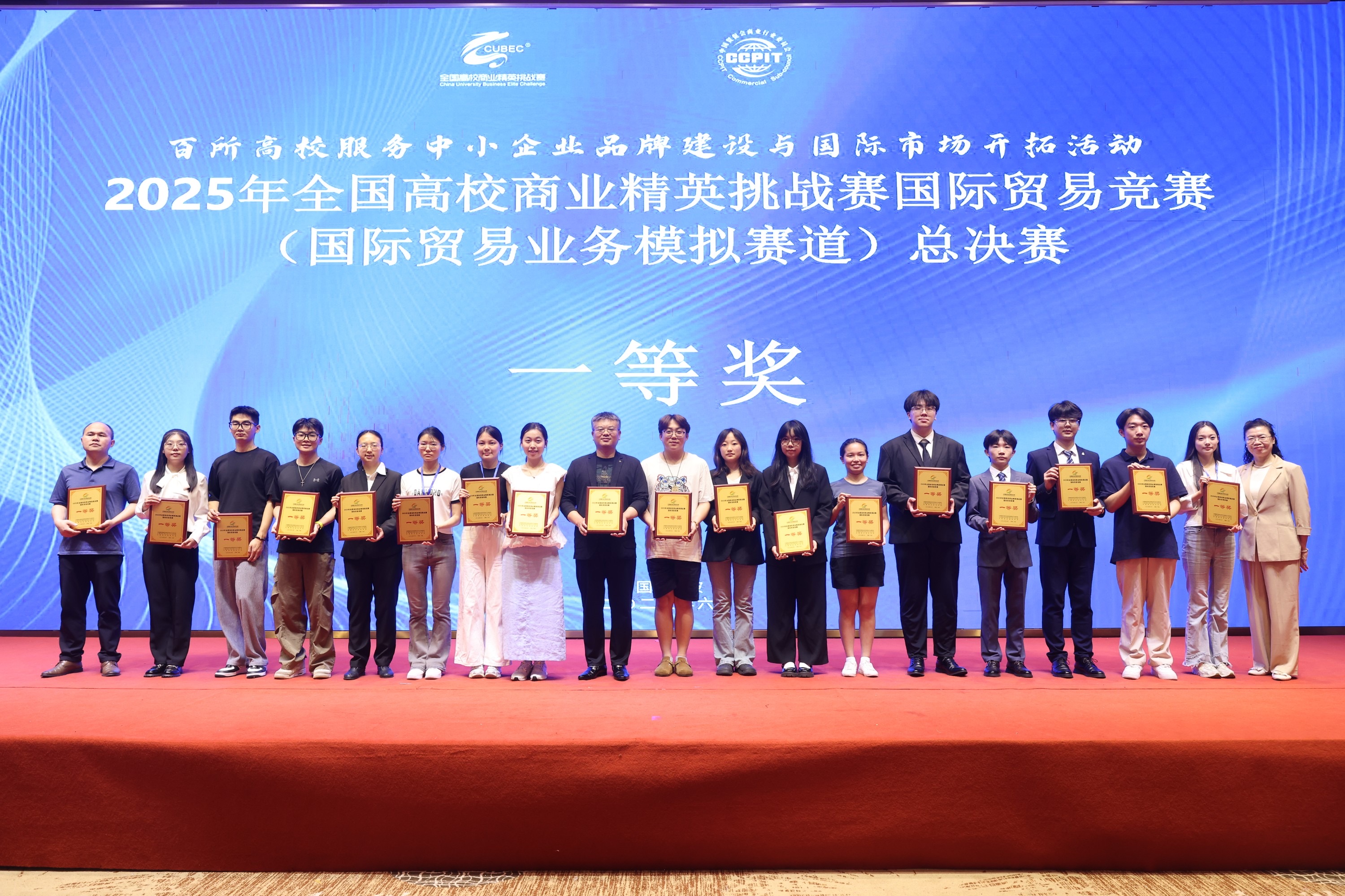 6月7日,2025年全国高校商业精英挑战赛国际贸易竞赛(国际贸易业务模拟赛道)总决赛在宁波国际会展中心开赛。我校数智商贸学院国际商务专业何继儒、傅筠媛、汪云娜、于梓阳、鲁申佳,国际经济与贸易专业黄钰淇组成参赛团队,经过激烈角逐,斩获学生组全国一等奖。指导老师傅祝屏、魏巧米、黄冬梅。同时,由傅祝屏、魏巧米、黄冬梅和陈夏兰(萧山二职国商教师)组成的中高职一体化教师竞赛团队参赛课程《出口交易磋商实训》获得教师组全国一等奖。