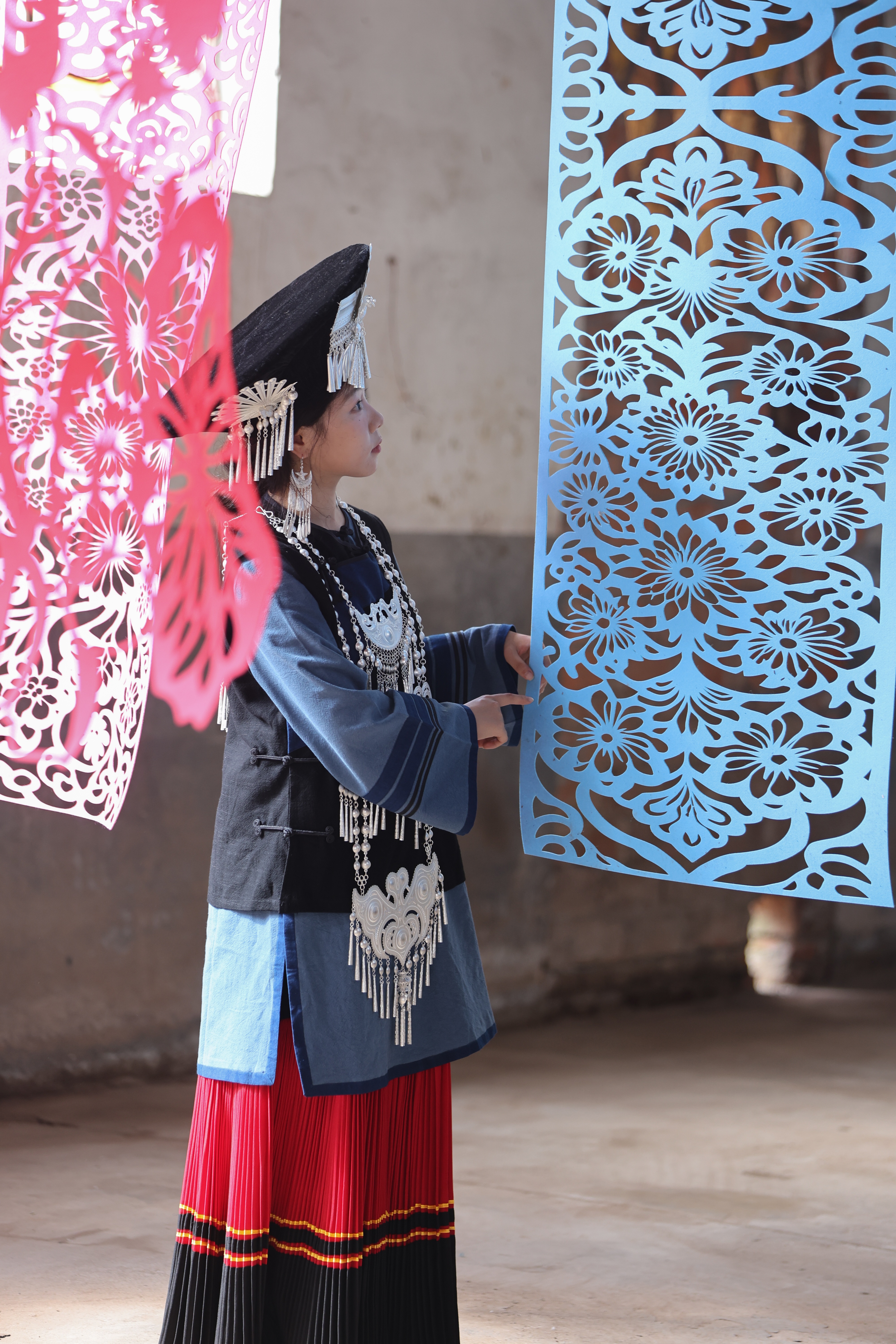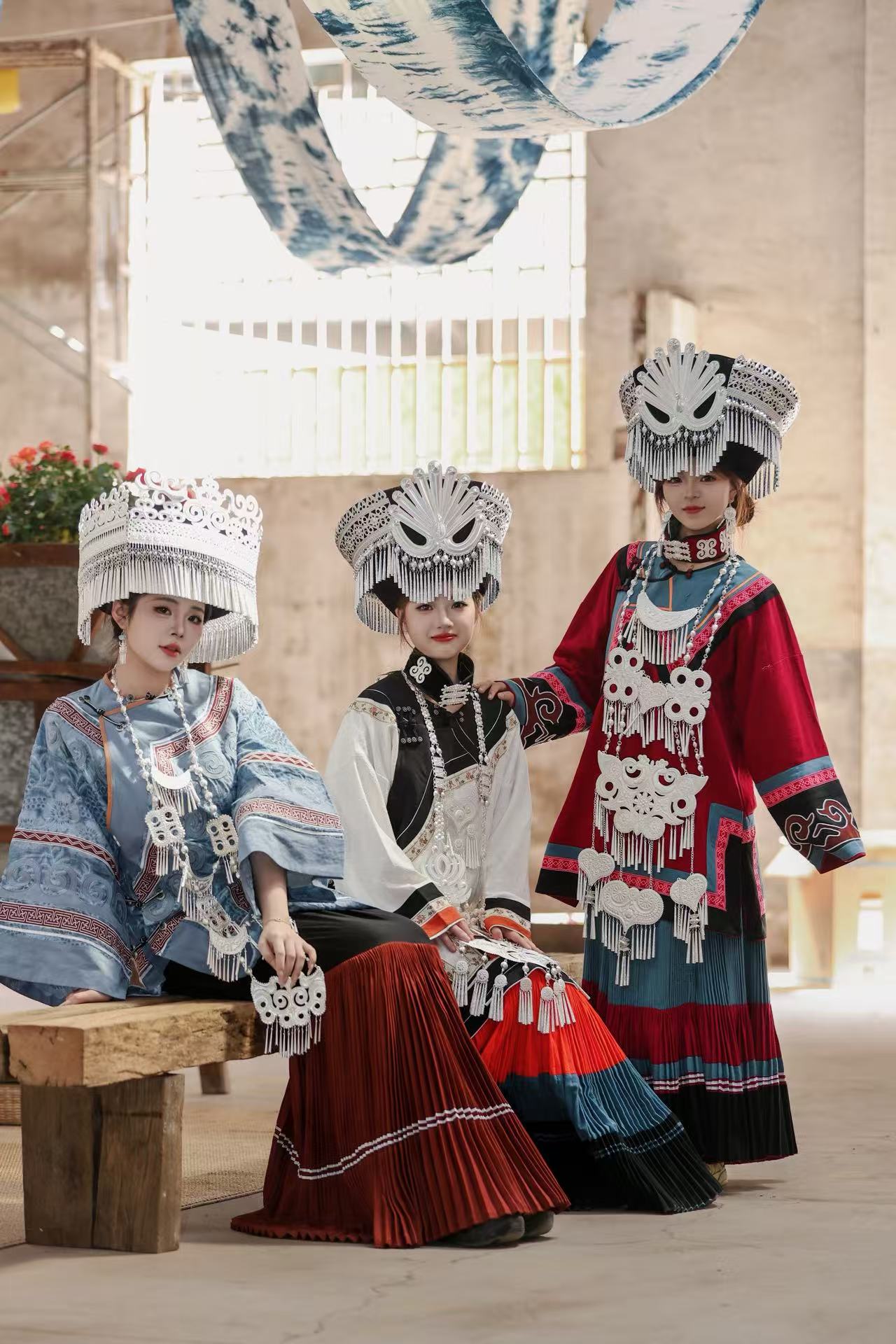 在化妆造型工作开始之前,四位学子体验了少数民族非遗服饰,参与了库川意境展宣传片的拍摄工作,在镜头前解锁“非遗传承者”的新身份。此次拍摄的服饰每一件都承载着独特的民族文化密码——彝族服饰刺绣的几何纹样中凝结着对自然的敬畏,一针一线间,勾勒出山川河流的脉络,诉说着民族千年的生活智慧与审美传承。