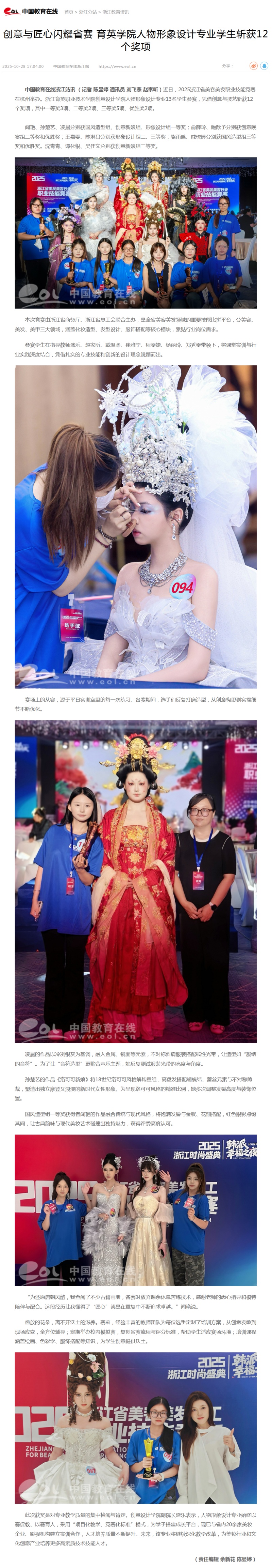 闻艳、孙楚艺、凌晨分别获国风造型组、创意新娘组、形象设计组一等奖;俞薛玲、鲍歆予分别获创意晚宴组二等奖和优胜奖;王嘉雯、陈淋吕分别获形象设计组二、三等奖;骆雨晗、戚琉婷分别获国风造型组三等奖和优胜奖。沈青青、谭化银、吴佳文分别获创意新娘组三等奖。