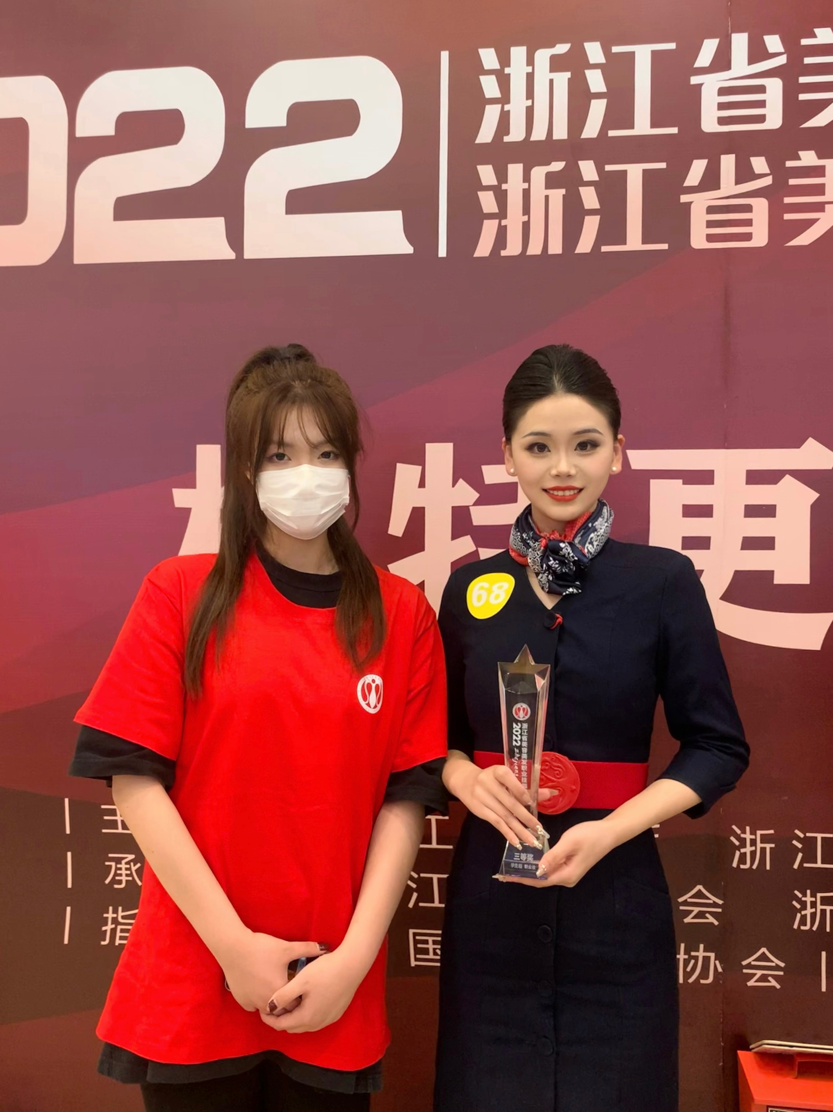 学生薛佳婷(右一)荣获2021浙江省美容美发职业技能竞赛一等奖