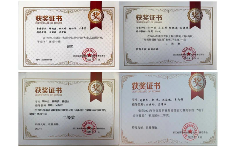 ●2025年获浙江省职业院校技能大赛(高职)“融媒体内容策划与制作”赛项金奖;“电子商务技能”赛项银奖;“商务数据分析”赛项铜奖。