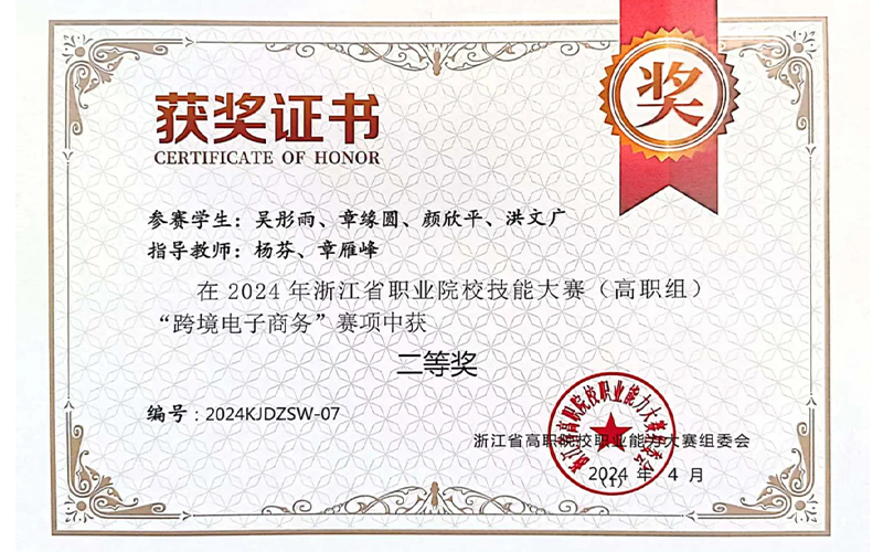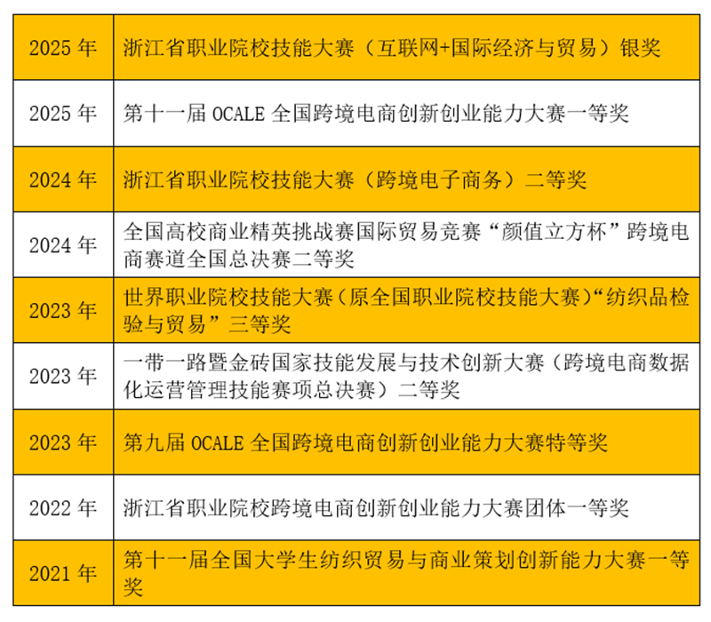 学校被授予全国跨境电商类专业“创新创业”人才培养示范校;全国跨境电商专员培训中心考培点;阿里巴巴国际站数字贸易人才基地;WISH跨境电商星青年优秀合作院校;教育部1+X试点第三批、第四批试点单位,并荣获2024年度跨境电商人才就业推荐奖和2023-2024年度跨境电商B2B数据运营1+X职业技能等级证书优秀教学成果奖。