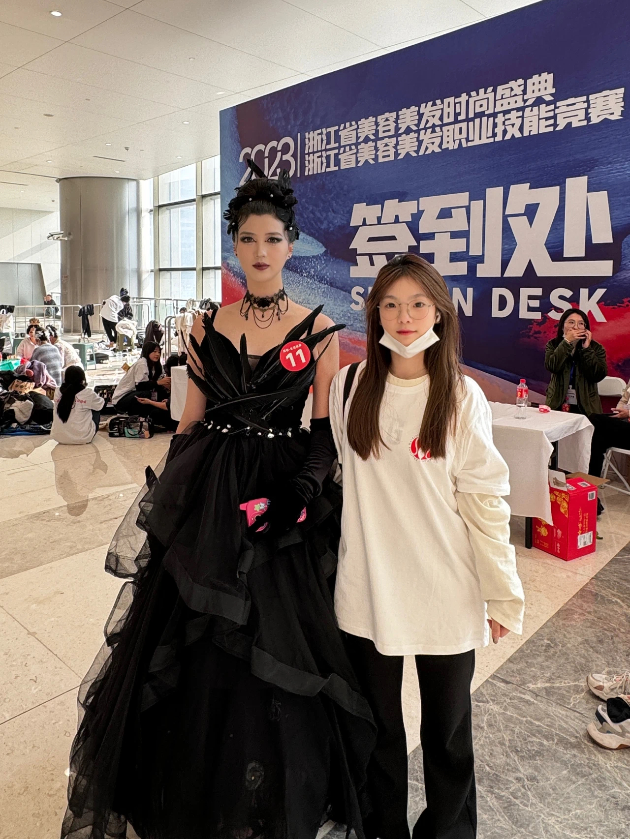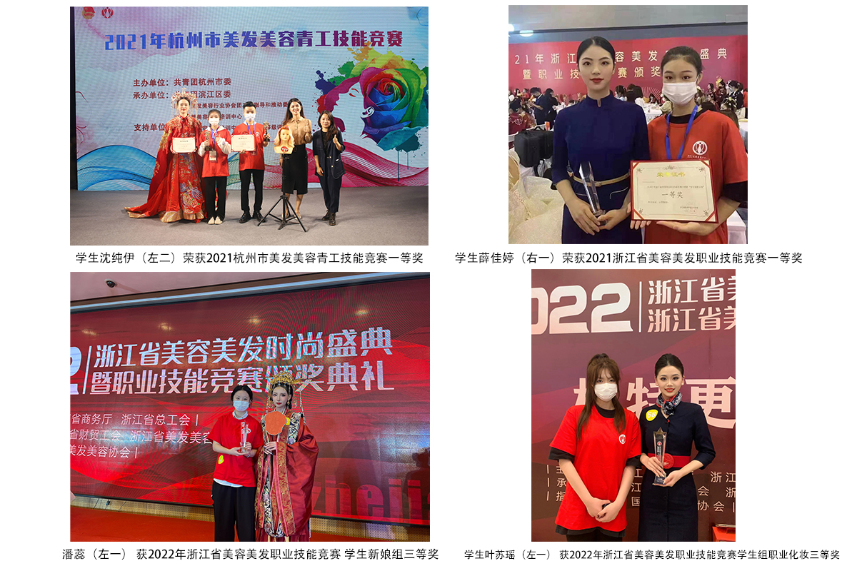 学生陈银(右一)获2023年浙江省美容美发职业技能竞赛创意晚宴化妆学生组三等奖